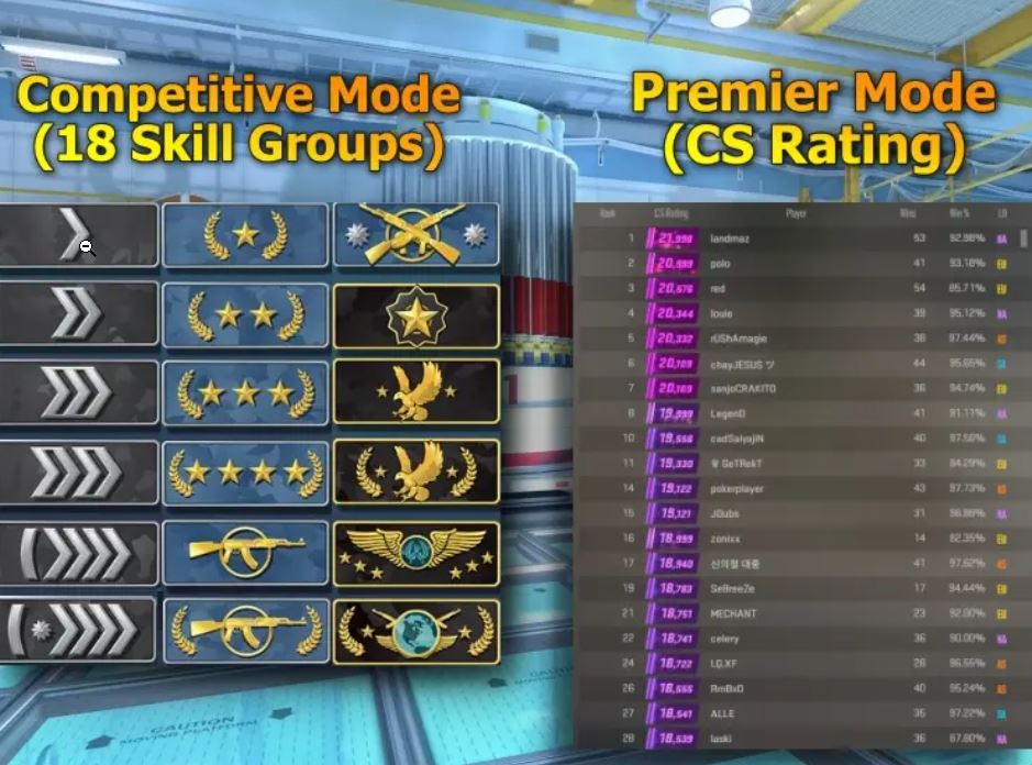 - открывает рейтинговые системы: Competitive Skill Groups (старые звания) и CS Rating в Premier